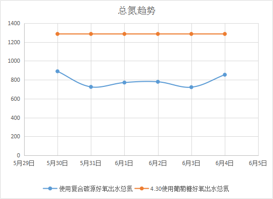 在生化系統(tǒng)厭氧池和缺氧池加入復(fù)合碳源101產(chǎn)品與菌種后,出水總氮持續(xù)下降,最終實(shí)現(xiàn)出水穩(wěn)定達(dá)標(biāo),降低運(yùn)行成本。