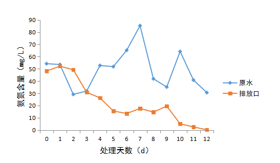 在接觸氧化池加入菌種3天后,出水氨氮顯著下降,10日后穩定低于8mg/L
