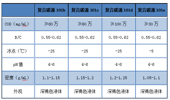 復(fù)合碳源101b,c,d,e系列:無色度,不發(fā)酵,冰點(diǎn)低,有效COD含量高,常規(guī)款產(chǎn)品為60萬、80萬、100 萬,也可私人訂制此范圍外的產(chǎn)品。