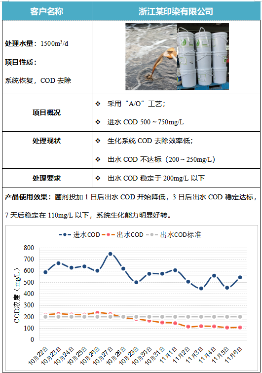 在眾多處理方法中,生物處理法是最為常規的處理方法,具有處理效率高,成本低等優點。如浙江某一印染廢水客戶,進水COD500mg/L到750mg/L,經過其生化系統處理后,COD依舊有200mg/L到250mg/L,此時客戶選用了庫巴魯®生物技術,投加了庫巴魯®COD激活菌301,3天實現出水COD達標,7天后穩定在110mg/L以下,遠低于其出水標準200mg/L。