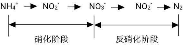 然后,在好氧環境內,通過硝化作用,將氨氮轉化為硝態氮;隨后在缺氧環境內,通過反硝化作用,將硝態氮轉化為氮氣,氮氣從水中逸出實現脫氮。