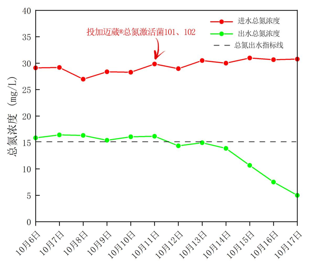 邁葳®總氮激活菌101、102顯著提升生化系統反硝化及耐低溫能力,出水總氮穩定<10mg/L。